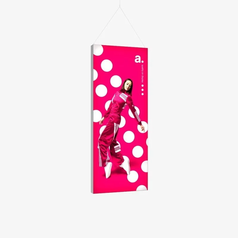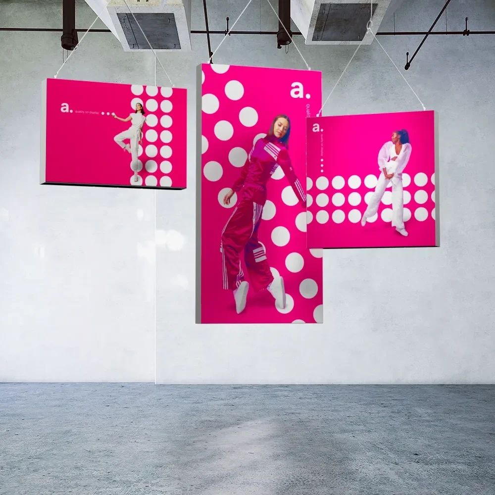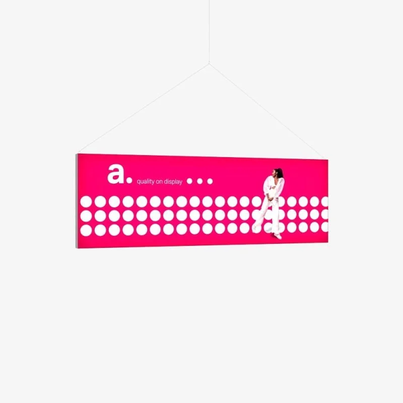 Het adFrame LMD Hanging is een hoogwaardig aluminium LED-frame, speciaal ontworpen voor ophanging boven beursstanden of presentaties. Het frame is op maat gemaakt en voorzien van heldere LED-edge verlichting rondom voor gelijkmatige en opvallende belichting van full color textielprints.