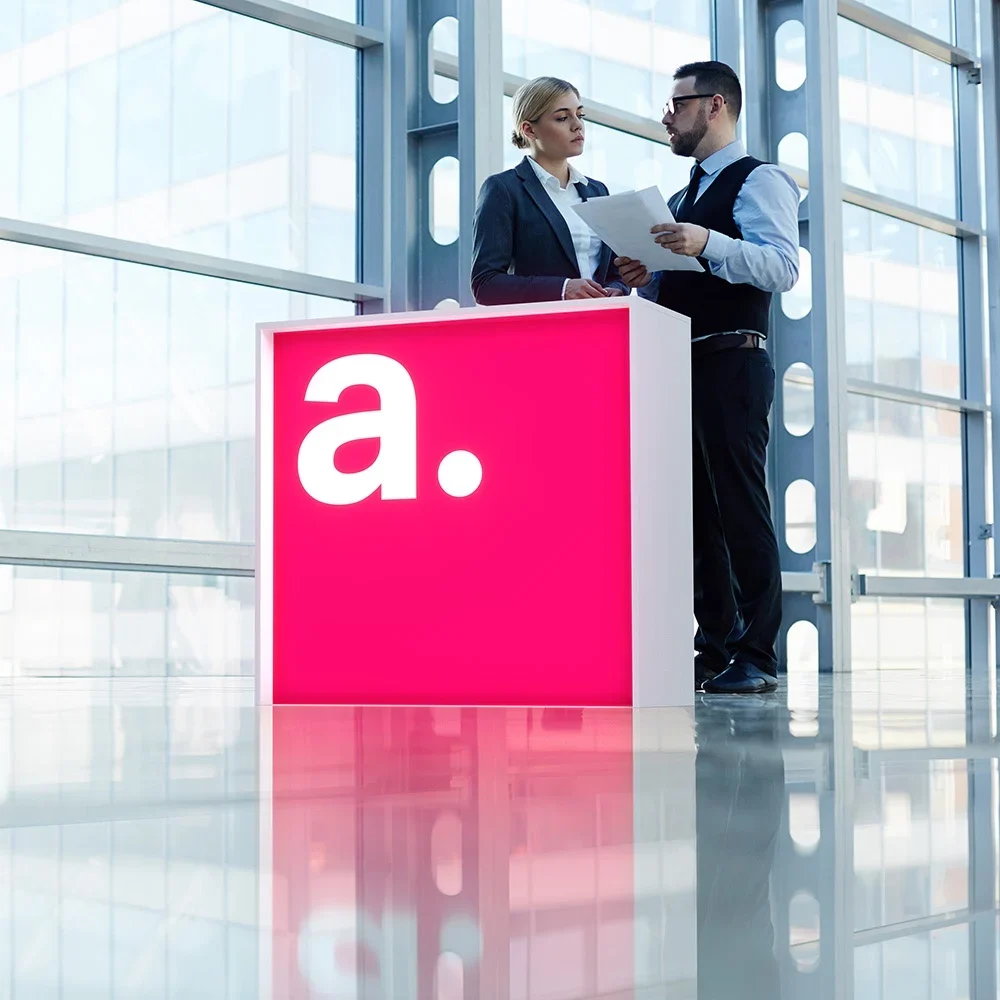 De adTribune Expo is een robuuste, verlichte beursbalie met direct verlicht LED-gordijn voor egale belichting van de full colour textielprint over het gehele oppervlak. Deze duurzame counter met lichtgewicht meubelplaat-constructie en praktische opbergplank is ideaal voor beurzen en evenementen.