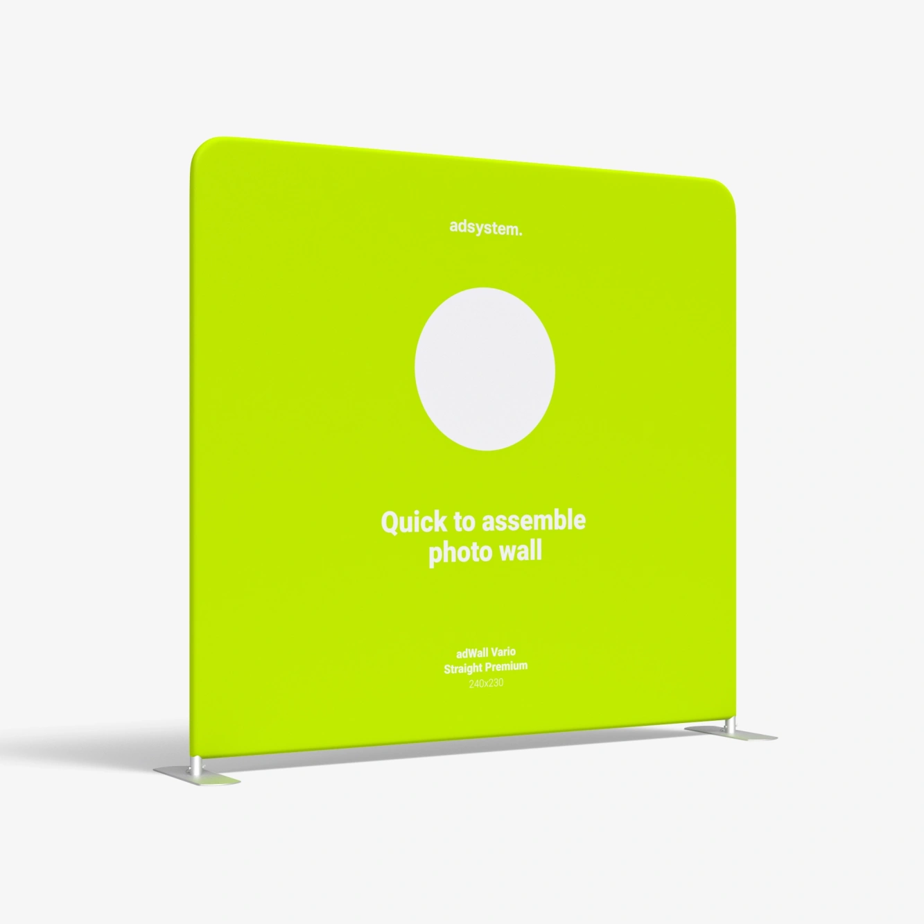 The prints perfectly match the contour shape of the tubular frame, creating a stylish image without creases or folds. Ironing is not necessary. Just pull the fabric over the frame and zipper it up. Once in place, it becomes invisible. It is an environmentally friendly form of advertising where the prints can be freely and repeatedly replaced. Made using sublimation technology, the material guarantees high-quality colors and images. The adWall Vario Straight advertising wall consists of aluminum tubes that are connected with intuitive snaps and simply need to be clicked together. Convenient markings make assembly easy for anyone, even without product knowledge. The adWall Vario Straight fits into a convenient carrying case. Attract attention with modern trade show wall solutions and don’t let your advertising get lost among the competition. Advantages: